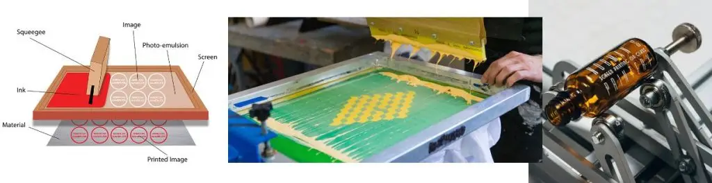 - Ink Application: The glass bottle is placed under the screen, and ink is applied to the top of the screen. A squeegee is used to push the ink through the open areas of the stencil onto the bottle.